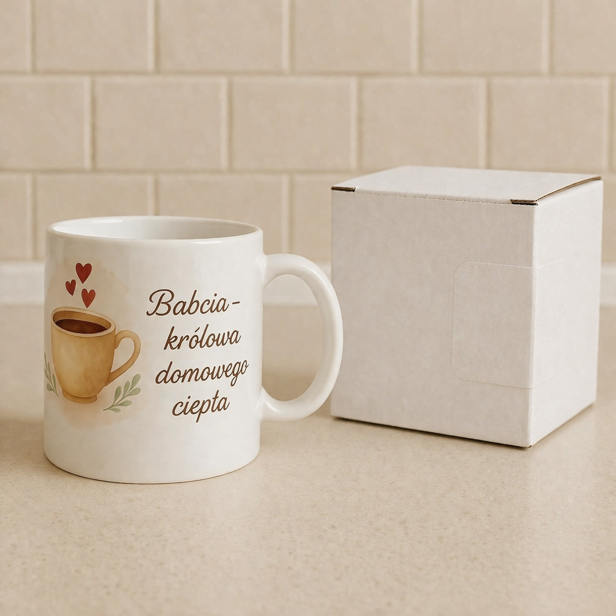 Kubek dla kochanej babci, subtelny nadruk z miłością. BABCIA-KRÓLOWA DOMOWEGO CIEPŁA