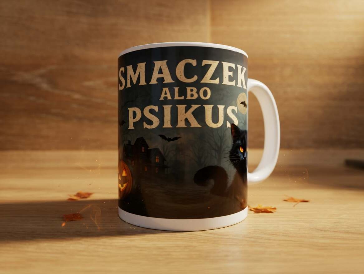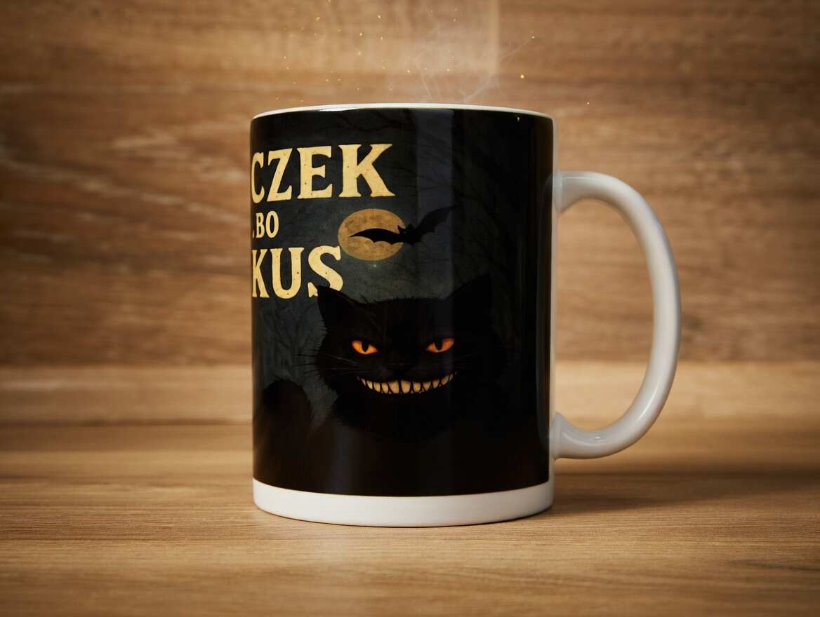 Magiczny klimat Halloween i czarny kot w tle – kubek „Smaczek albo psikus” dla fanów grozy i humoru 👻